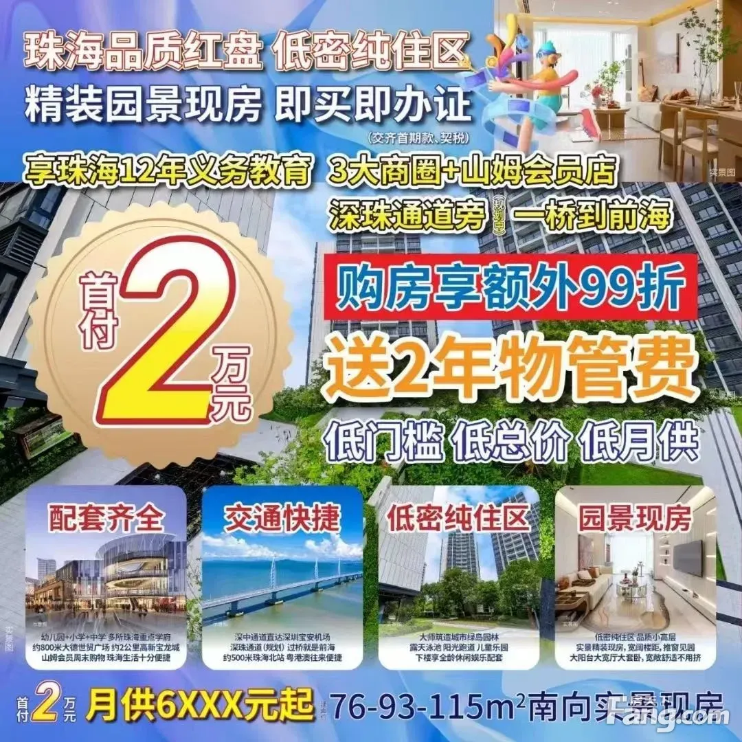 唐家北围新推0首付房源!直接月供! 颐璟名庭!纯月供直接上车啦 在售:79平米-93平米-96平米三房、105平米四房(全部精装现楼!即买即!无顾虑) 珠海北轻轨站旁!商场旁!深珠通道旁