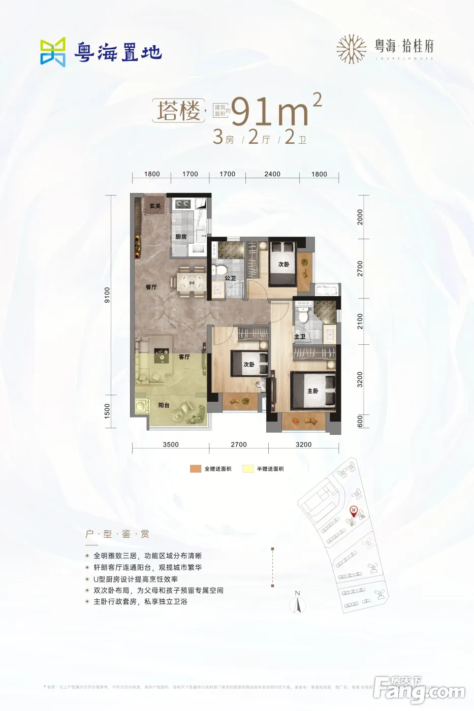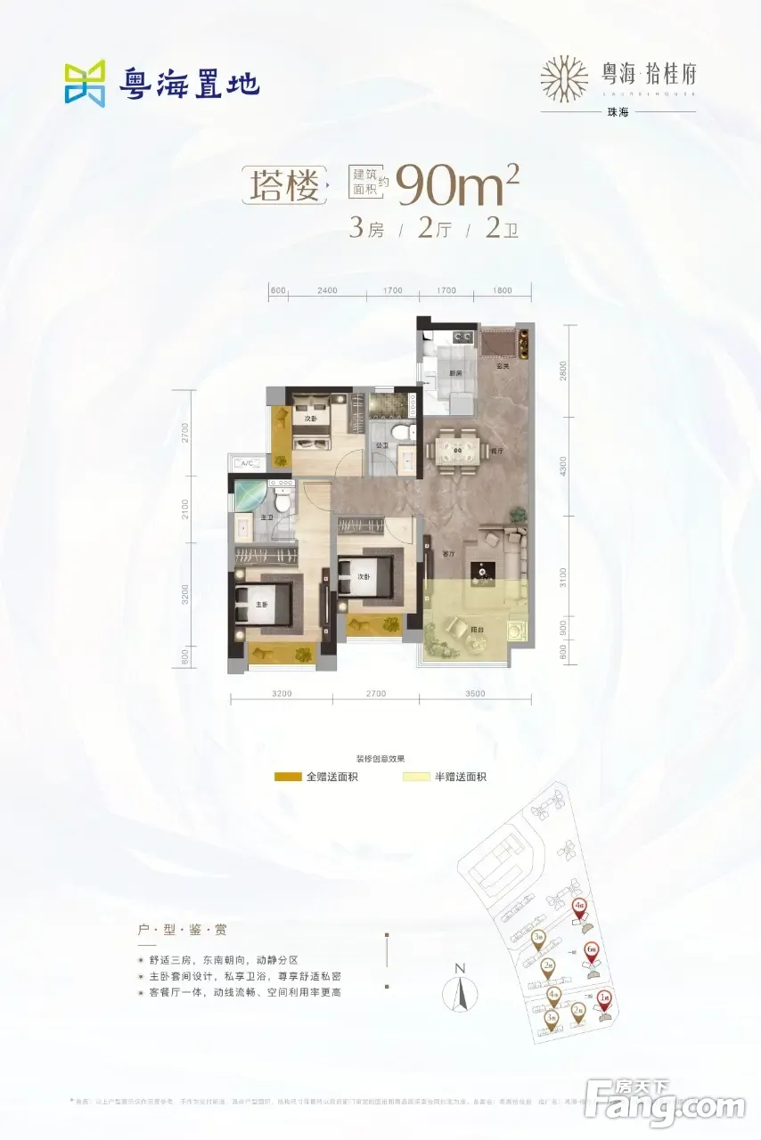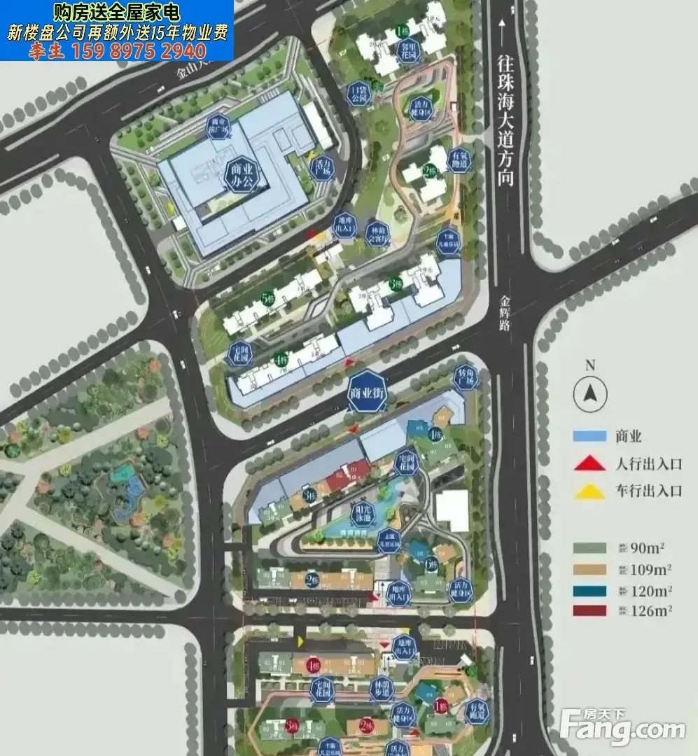 【项目位置】:珠海市.金湾航空新城.华发商都旁 【占地面积】:约6万㎡【总建筑面积】:约25万㎡ 【综合容积率】:2.77【绿化率】:32.9% 【总户数】:1538 【主力户型】:65-128㎡二至四房 【户型结构】:点式塔楼、板楼设计,户型南北通透 【交付标准】:精装交付 【物业管理】:粤海物业管理有限公司珠海公司(物业管理资质)