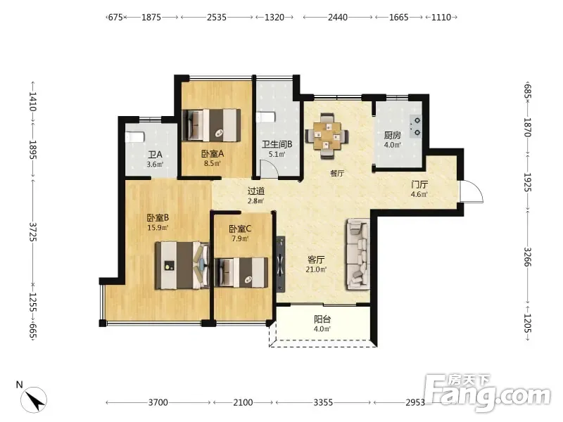 房屋拥有相对宽松的尺寸,布局通透,动静分离,设计合理
