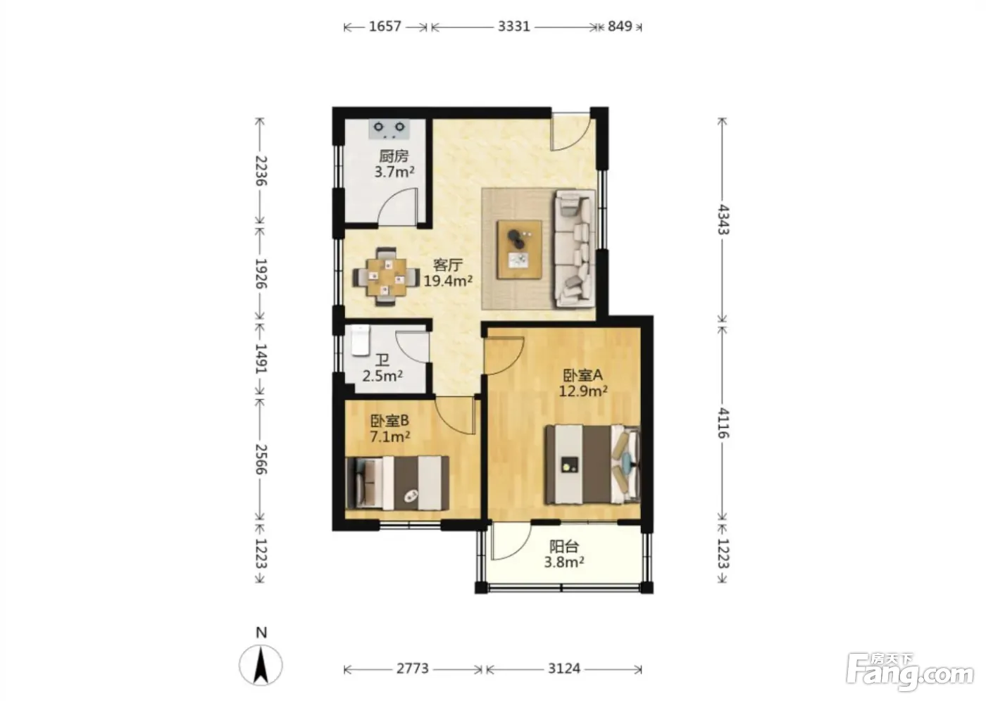 户型齐全,主打明厨,客厅朝南二居