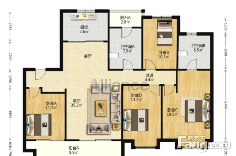 户型齐全,主打卧室朝南,卧室带阳台四居