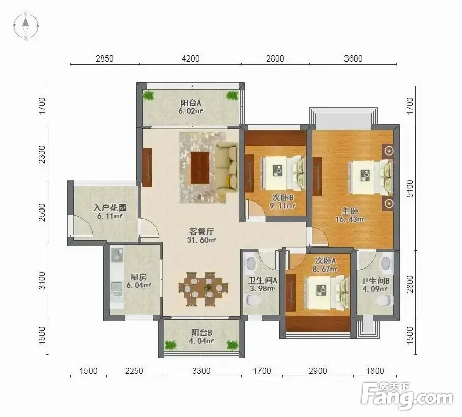 户型齐全,主打户型方正,采光充足,主卧带卫,双阳台,入户花园三居