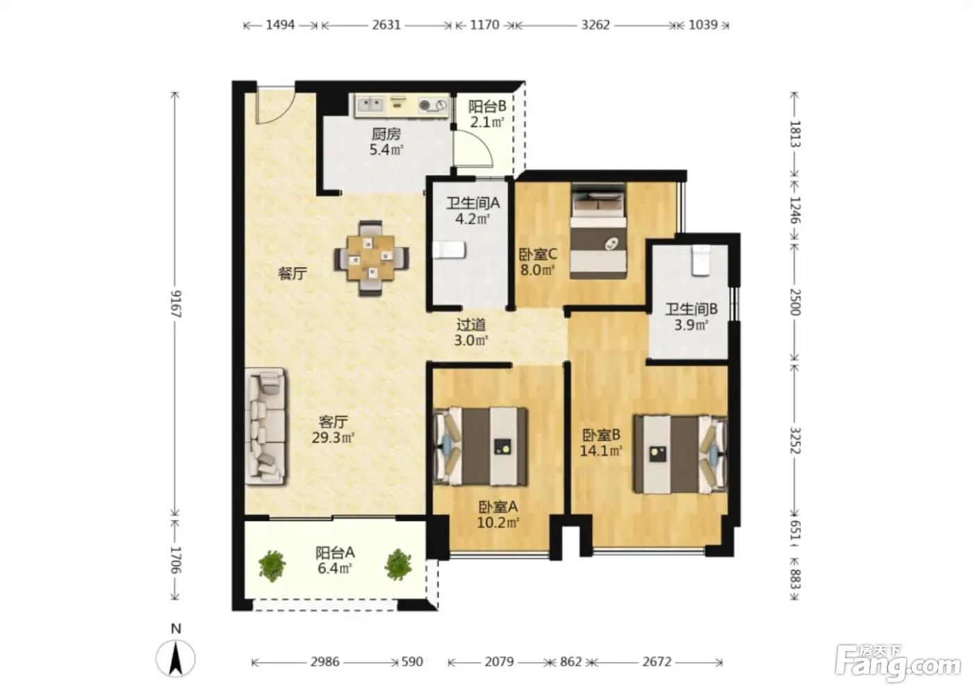 户型齐全,主打南北通透,户型方正,动静分离,主卧带卫,双阳台,入户花园三居