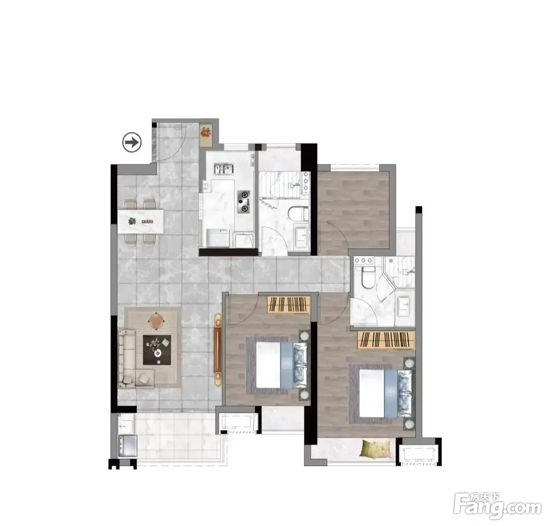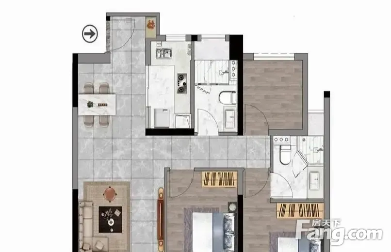 户型齐全,主打户型方正,采光充足,主卧带卫,干湿分离,餐客分离二居
