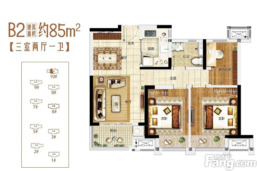 亚新美好天境户型主要有85平-130平的客厅朝南,主卧朝南,主卧带卫,带衣帽间的三居 。