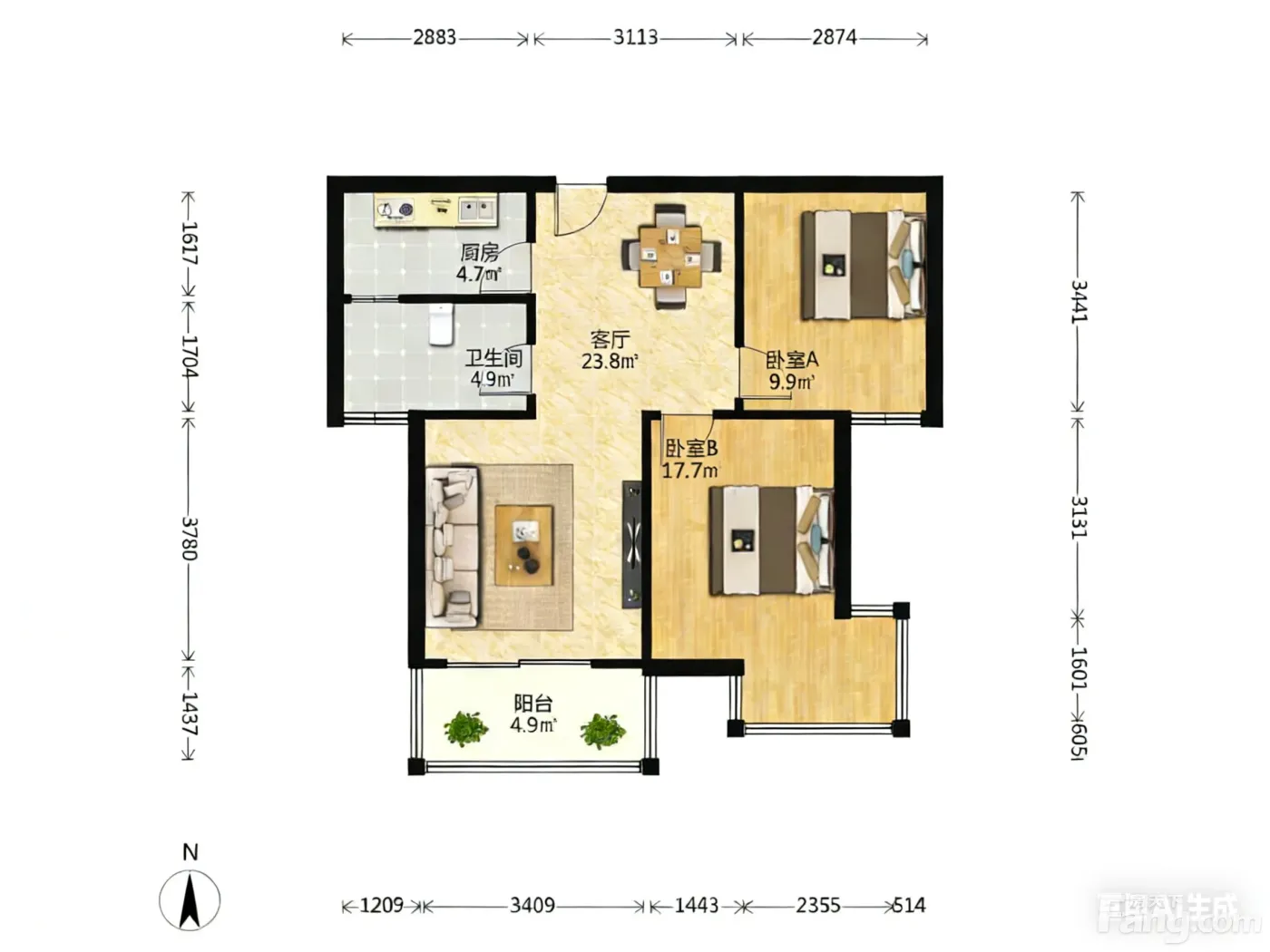 户型齐全,主打明厨,客厅朝南二居