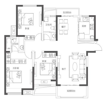 户型齐全,主打客厅朝南,主卧朝南,观景飘窗,干湿分离三居