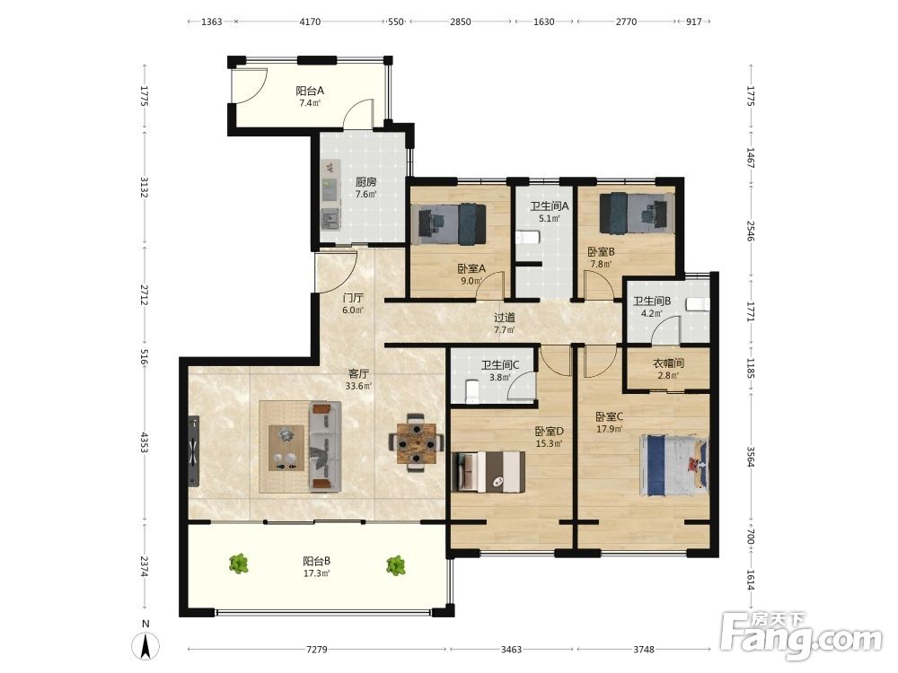 户型齐全,主打南北通透,全明格局,动静分离,客厅朝南,主卧朝南,主卧带卫,中西双厨,双阳台四居