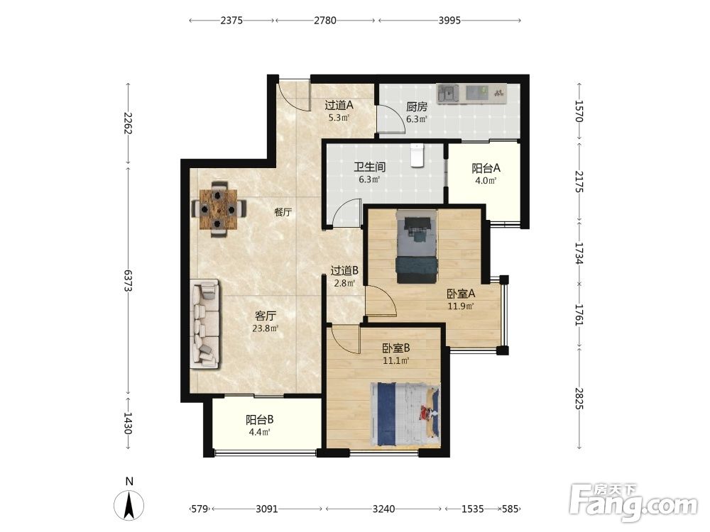 户型齐全,主打户型方正,客厅朝南,主卧朝南二居