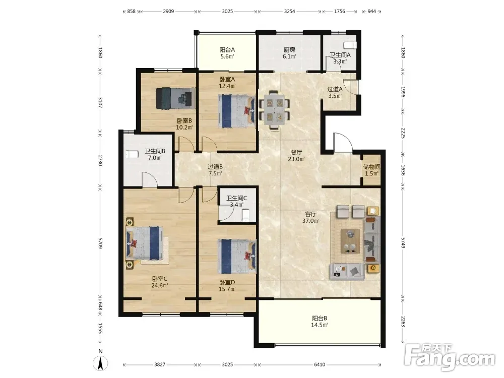 户型齐全,主打南北通透,全明格局,动静分离,客厅朝南,主卧朝南,主卧带卫,中西双厨,双阳台四居