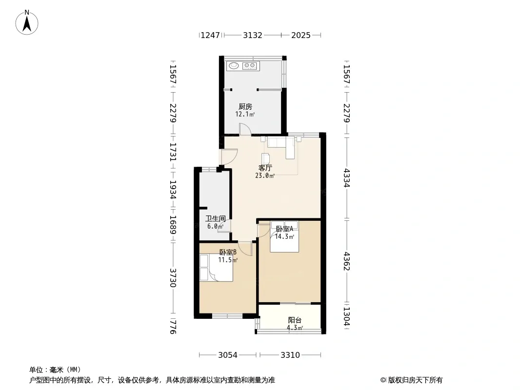 户型齐全,主打明卫,明厨,客厅朝南,双阳台三居