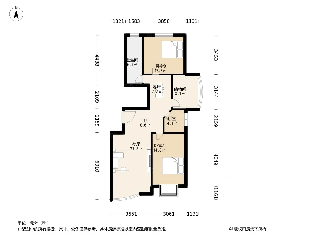 户型齐全,主打明卫,独立衣帽间,明厨,客厅朝南,双阳台三居