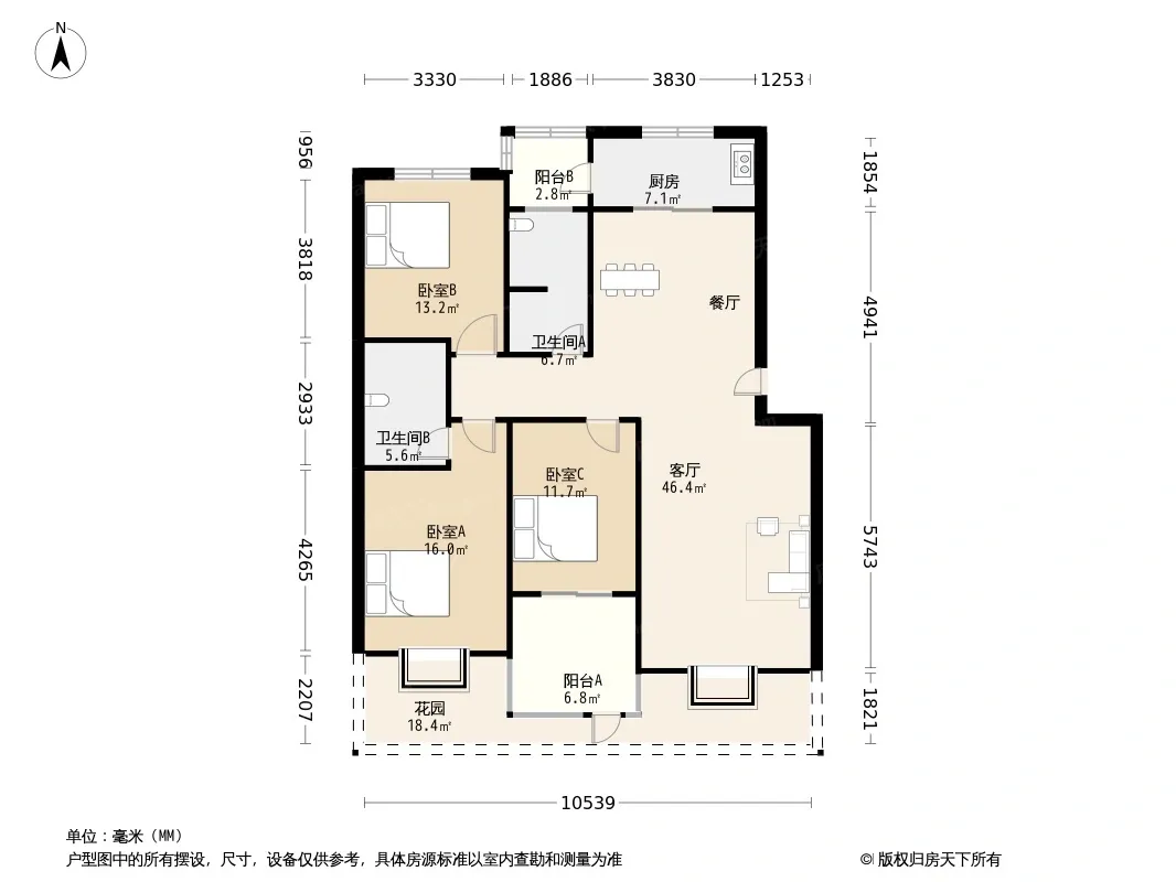 户型齐全,主打明卫,独立衣帽间,明厨,客厅朝南,双阳台三居