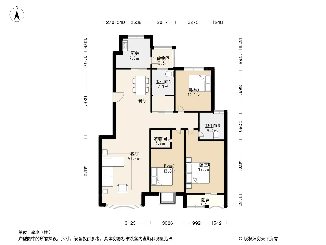 户型齐全,主打明卫,独立衣帽间,明厨,客厅朝南,双阳台三居