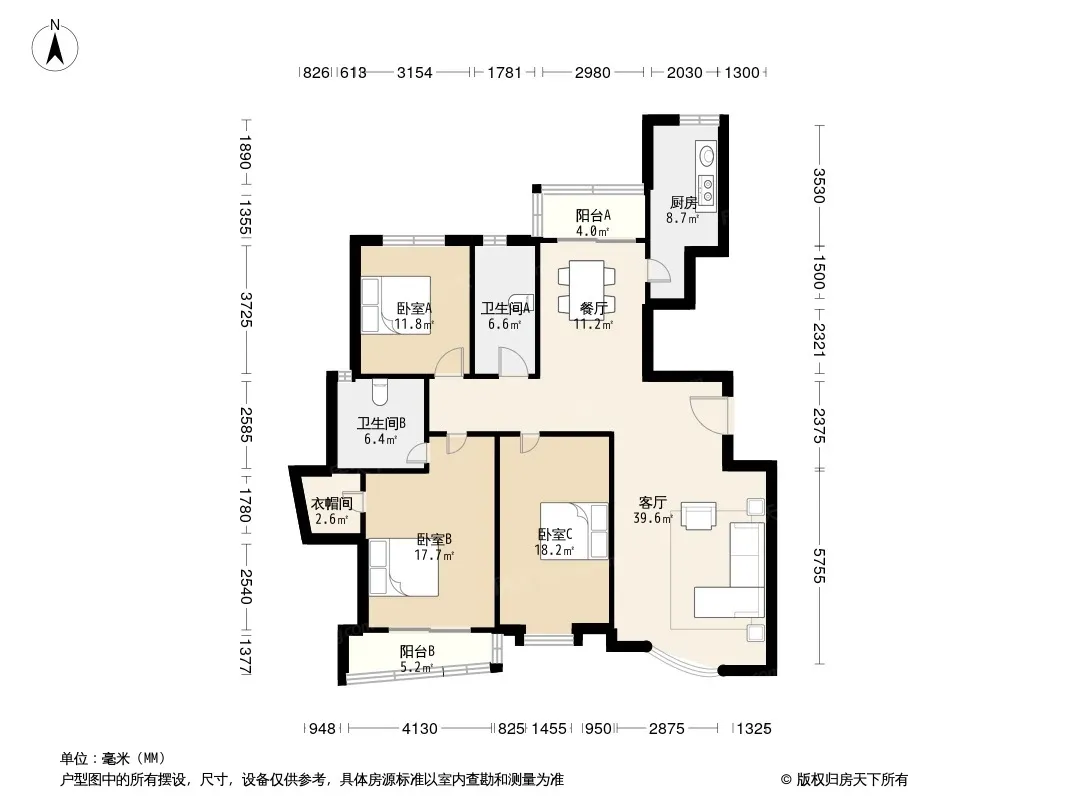户型齐全,主打明卫,独立衣帽间,明厨,客厅朝南,双阳台三居