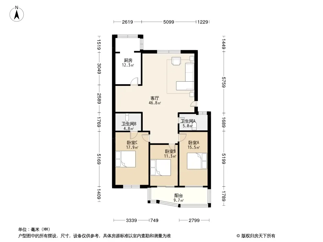 户型齐全,主打明厨,客厅朝南,双阳台,主卧朝南三居