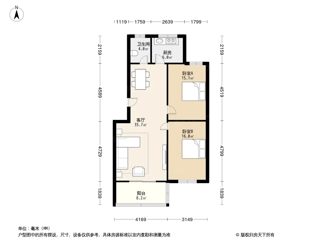 户型齐全,主打明厨,明卫,客厅朝南二居