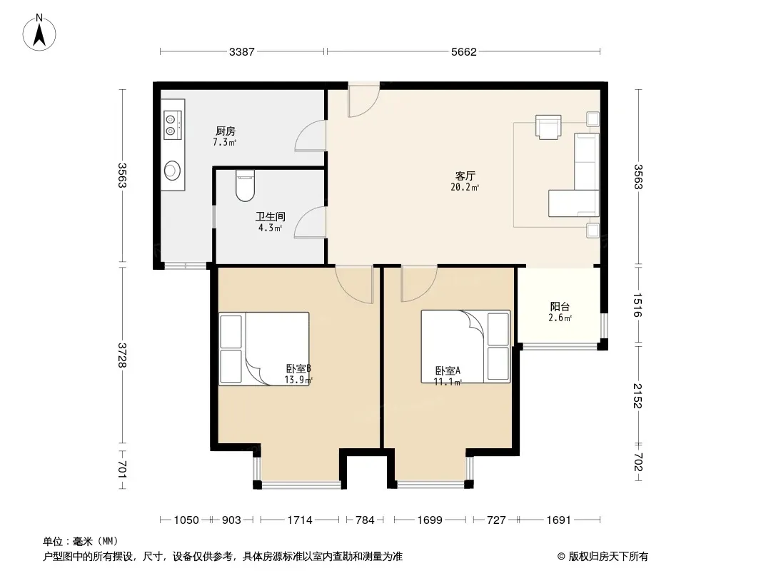 户型齐全,主打明厨,客厅朝南,主卧朝南二居