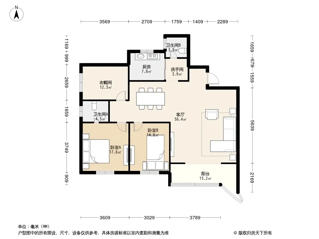 户型齐全,主打户型方正,明卫,独立衣帽间,明厨,客厅朝南,双阳台三居