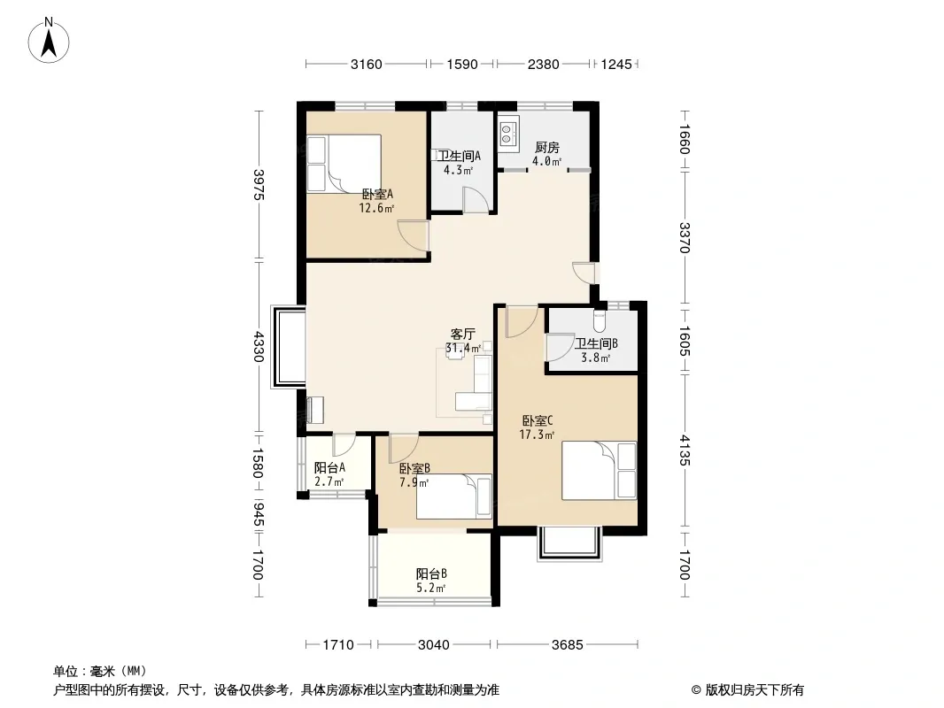 户型齐全,主打明厨,客厅朝南,主卧朝南三居