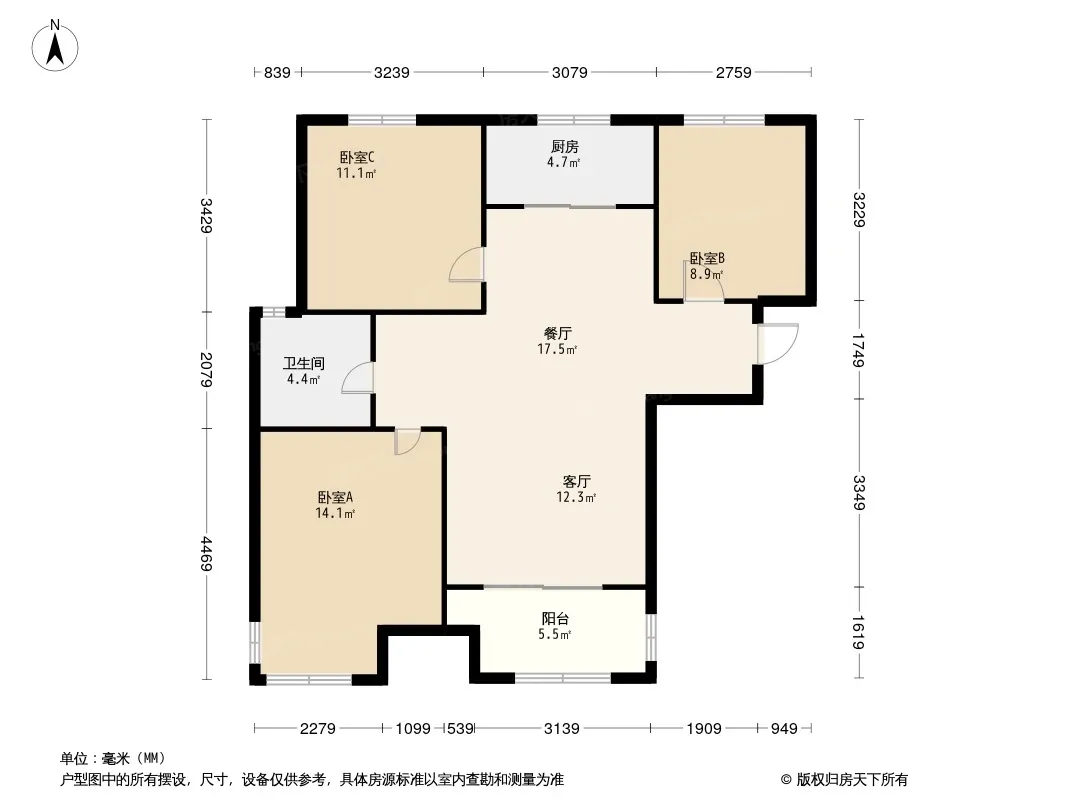 户型齐全,主打全明格局,户型方正,动静分离,采光充足三居