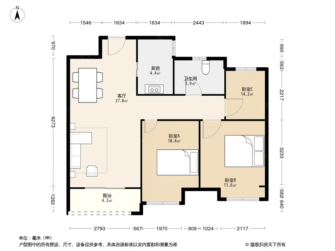 户型齐全,主打户型方正,明卫,明厨,客厅朝南,主卧朝南三居
