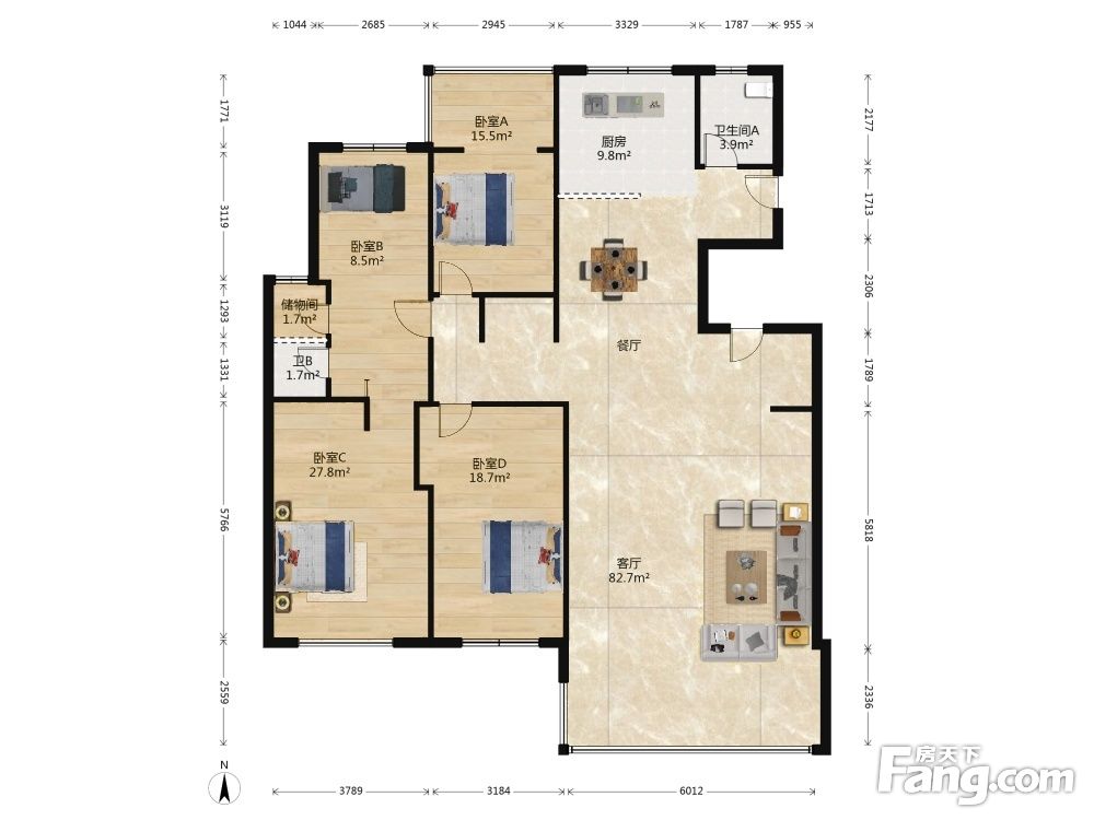 户型齐全,主打南北通透,全明格局,动静分离,客厅朝南,主卧朝南,主卧带卫,中西双厨,双阳台四居
