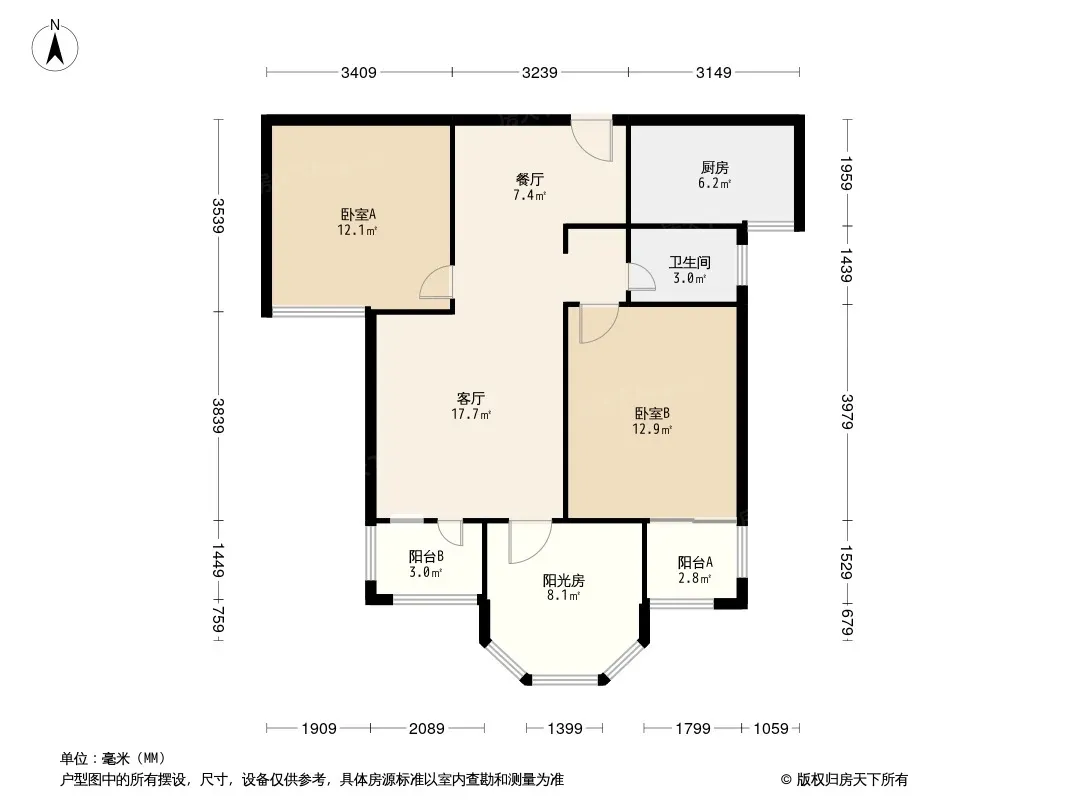 户型齐全,主打客厅朝南,卧室朝南,主卧朝南,明厨明卫,干湿分离,双阳台三居