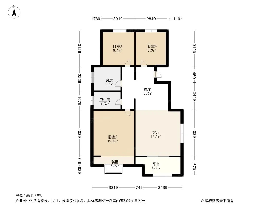 户型齐全,主打南北通透,全明格局,客厅朝南,主卧朝南,餐客分离,入户花园三居