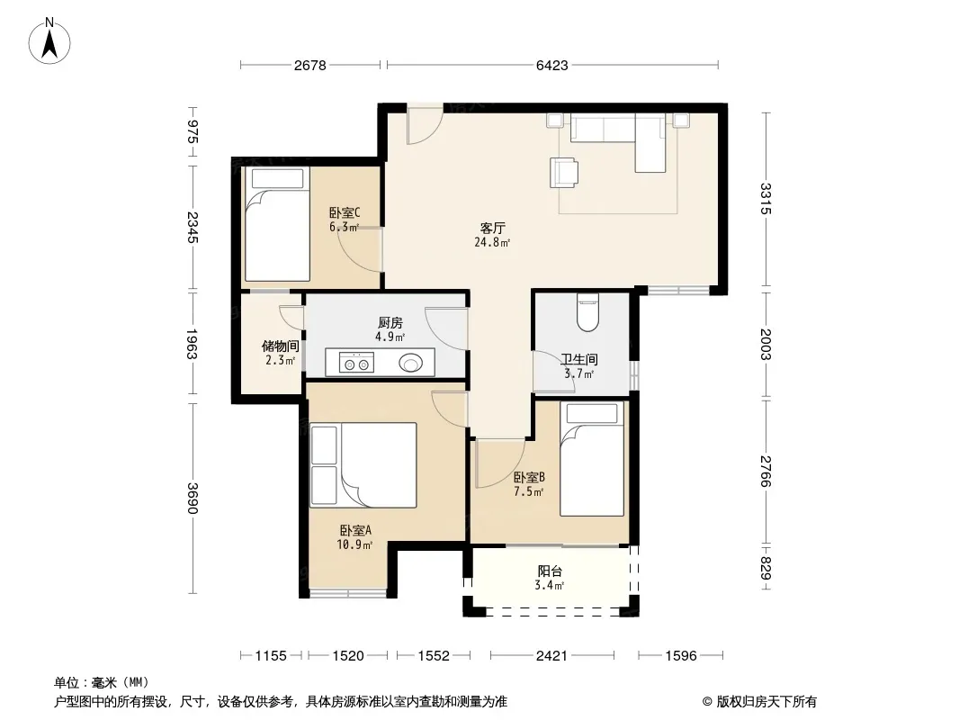 户型齐全,主打明卫,客厅朝南,主卧朝南三居