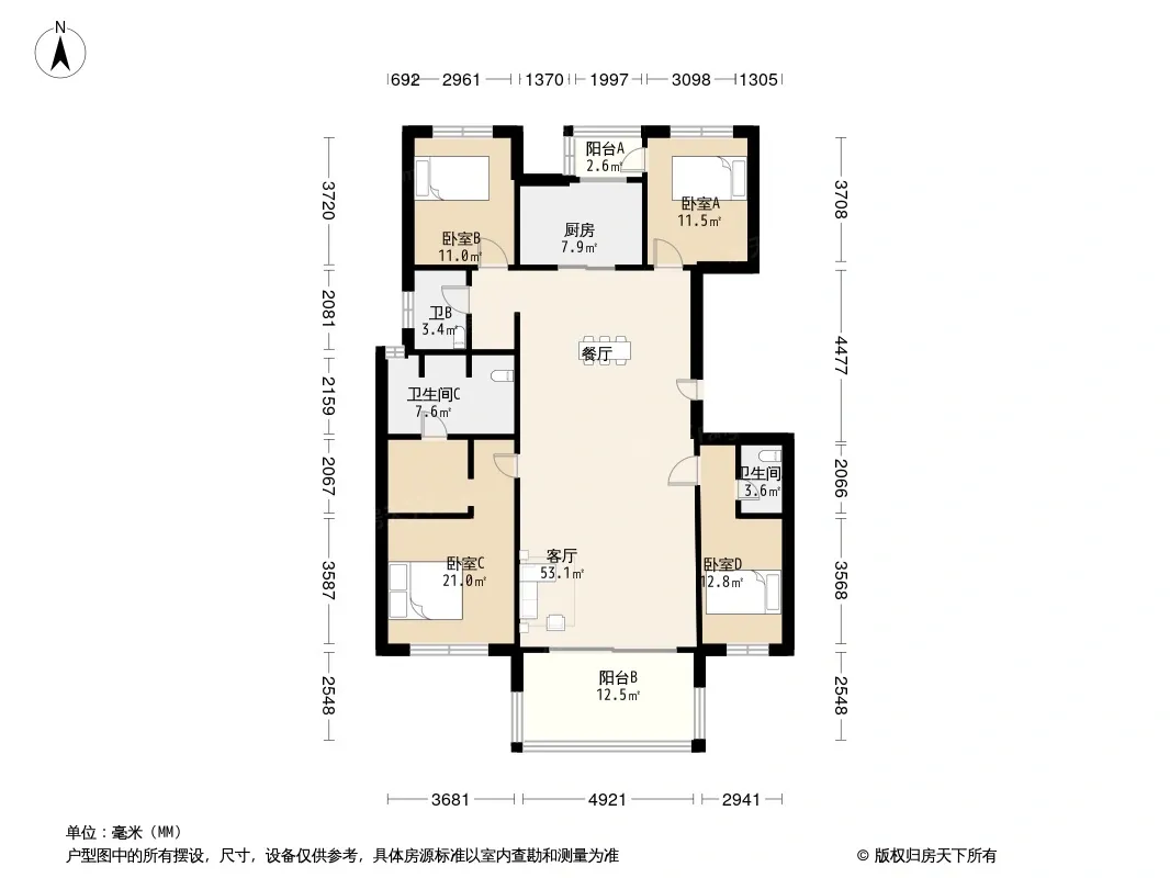户型齐全,主打南北通透,客厅朝南四居