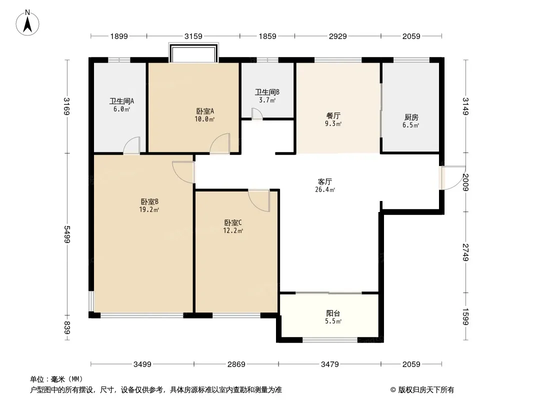 户型齐全,主打客厅朝南,主卧朝南,主卧带卫三居