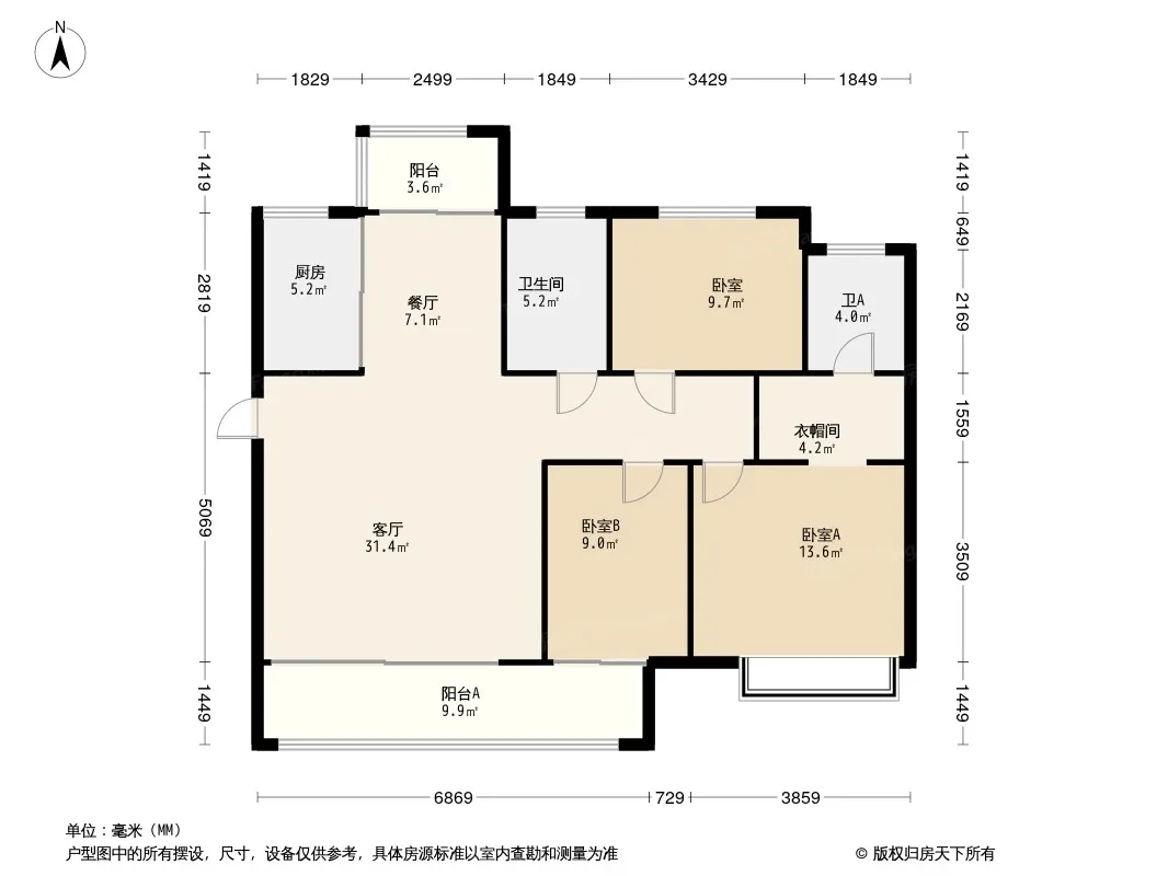 户型齐全,主打南北通透,客厅朝南,主卧朝南,主卧带卫三居