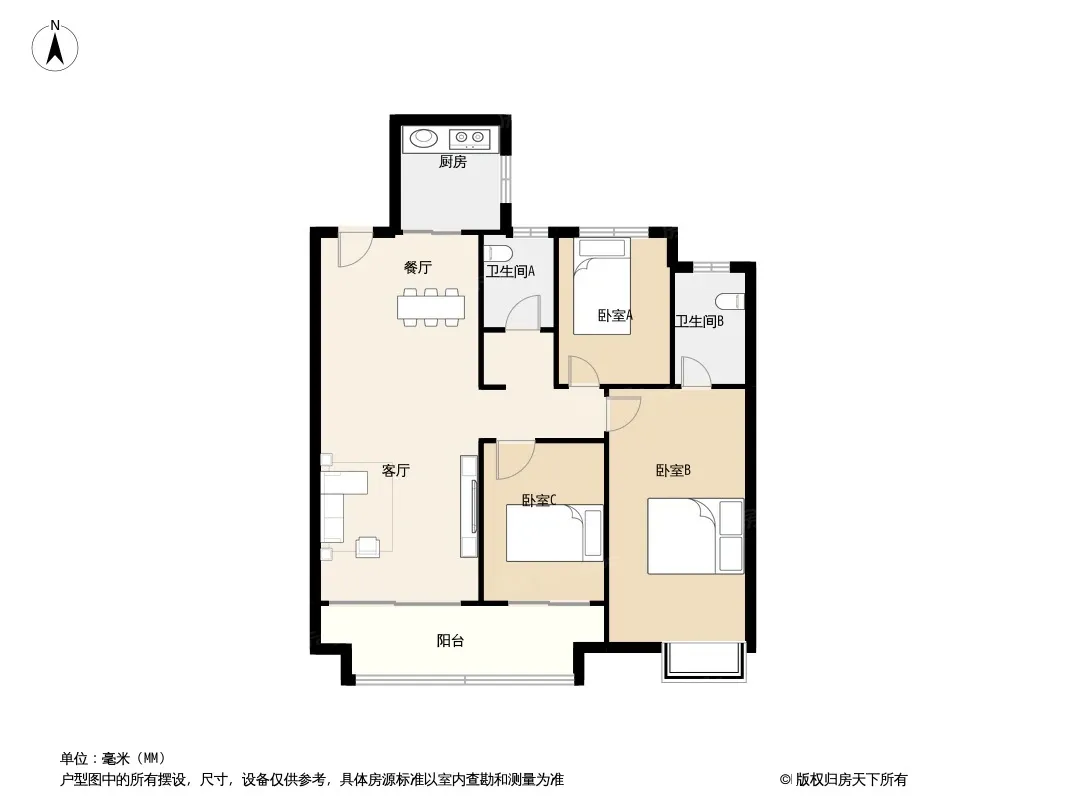 户型齐全,主打主卧带卫,U型厨房三居