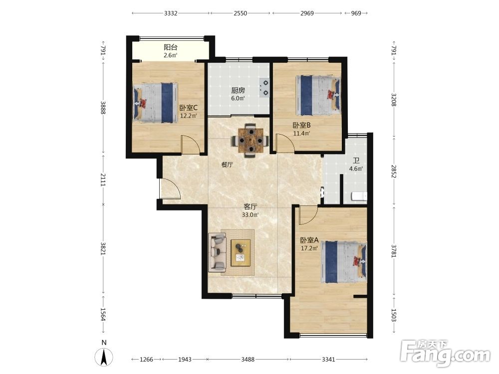 户型齐全,主打南北通透,全明格局,户型方正三居