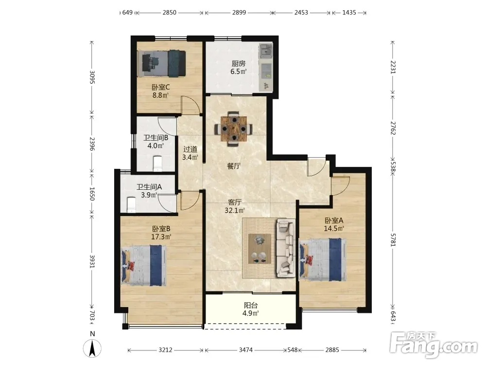 户型齐全,主打南北通透,全明格局,户型方正三居