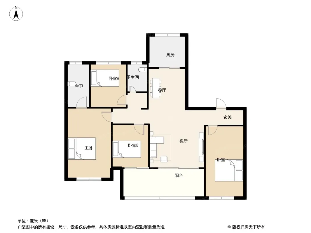 户型齐全,主打南北通透,户型方正,客厅朝南,主卧带卫四居