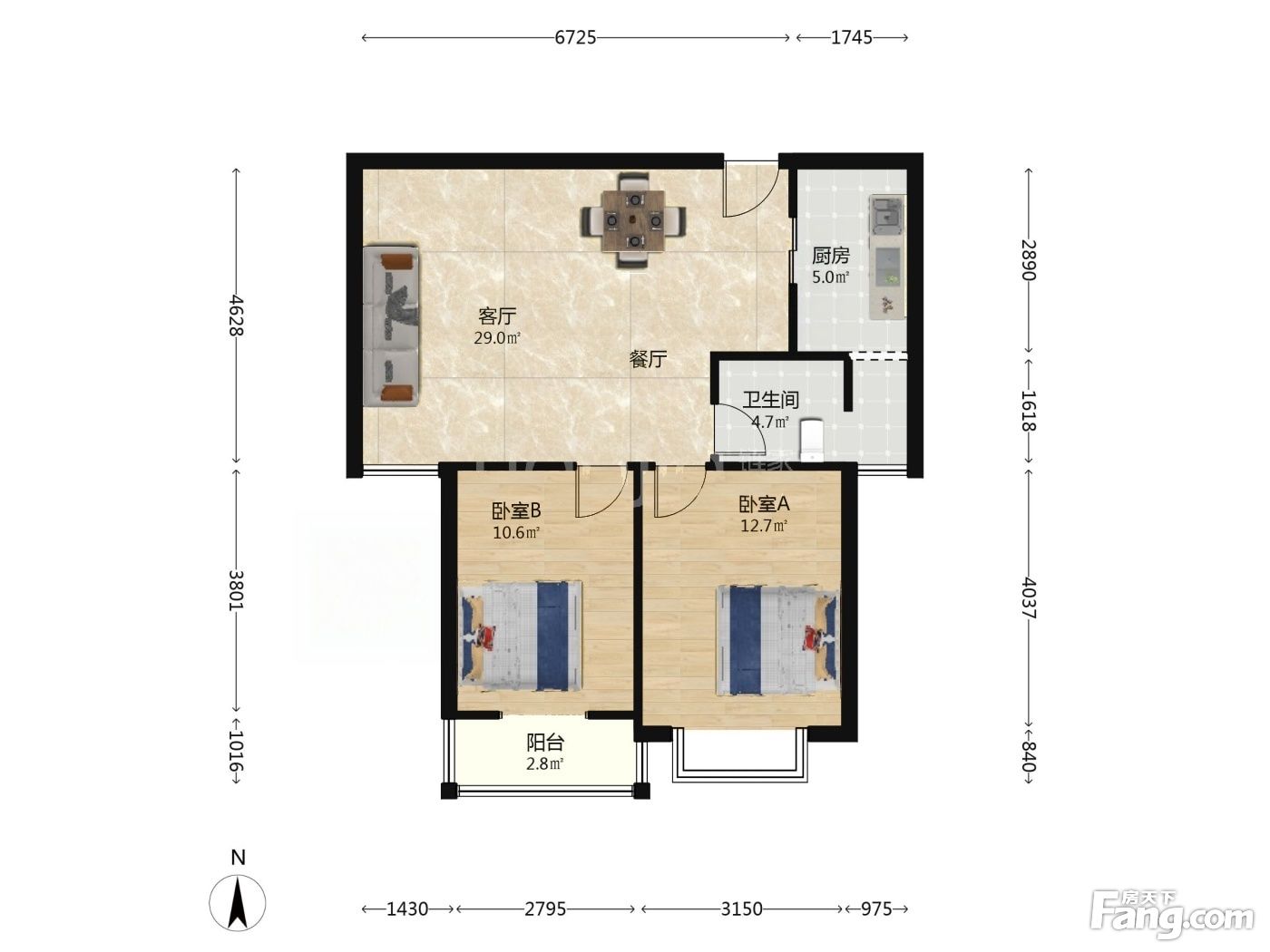 户型齐全,主打明卫,客厅朝南,主卧朝南二居