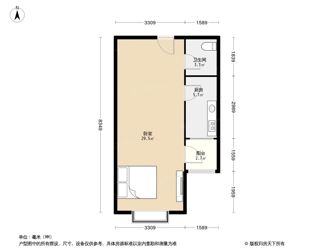 户型齐全,主打明厨,明卫,客厅朝南,全明格局一居