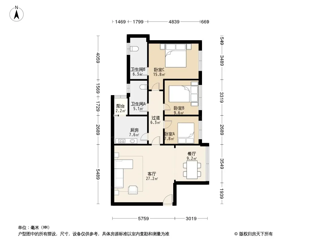 户型齐全,主打明卫,客厅朝南三居