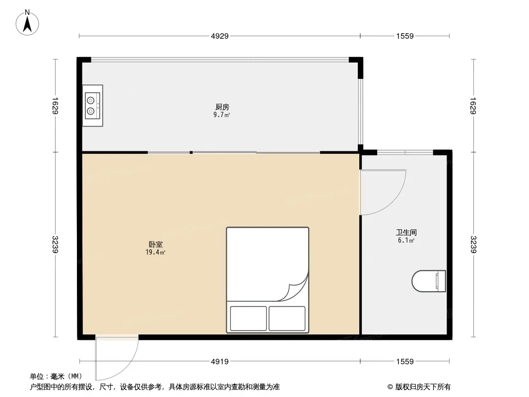 户型齐全,主打明厨,明卫,客厅朝南,全明格局一居