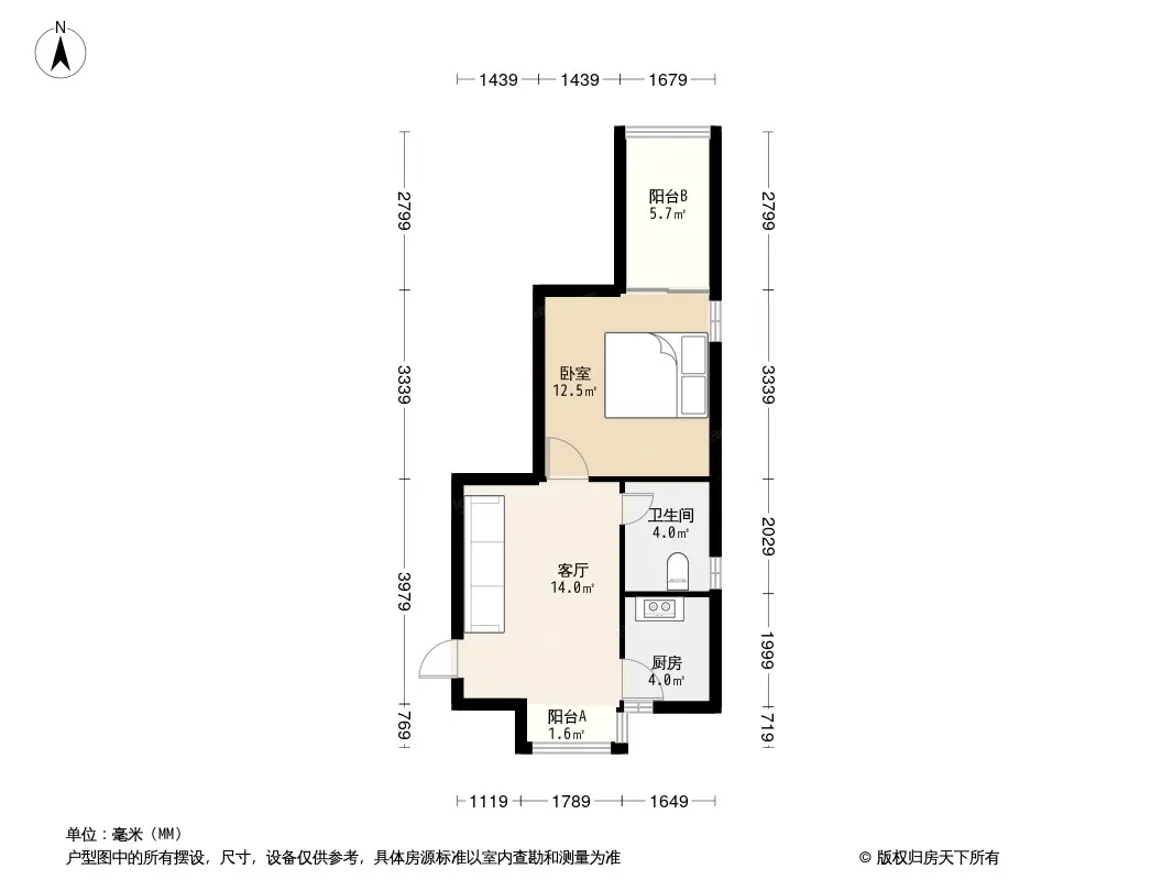 户型齐全,主打明厨,明卫,客厅朝南,全明格局一居