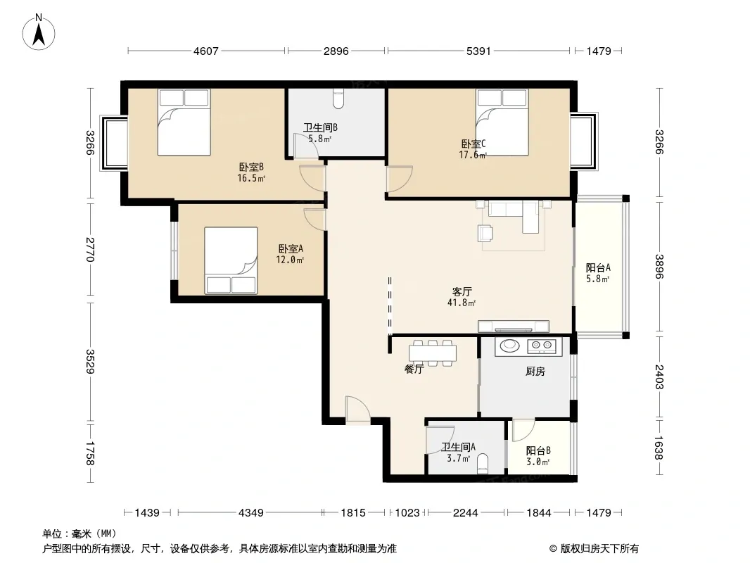 户型齐全,主打明厨,客厅朝南,双卧朝南三居