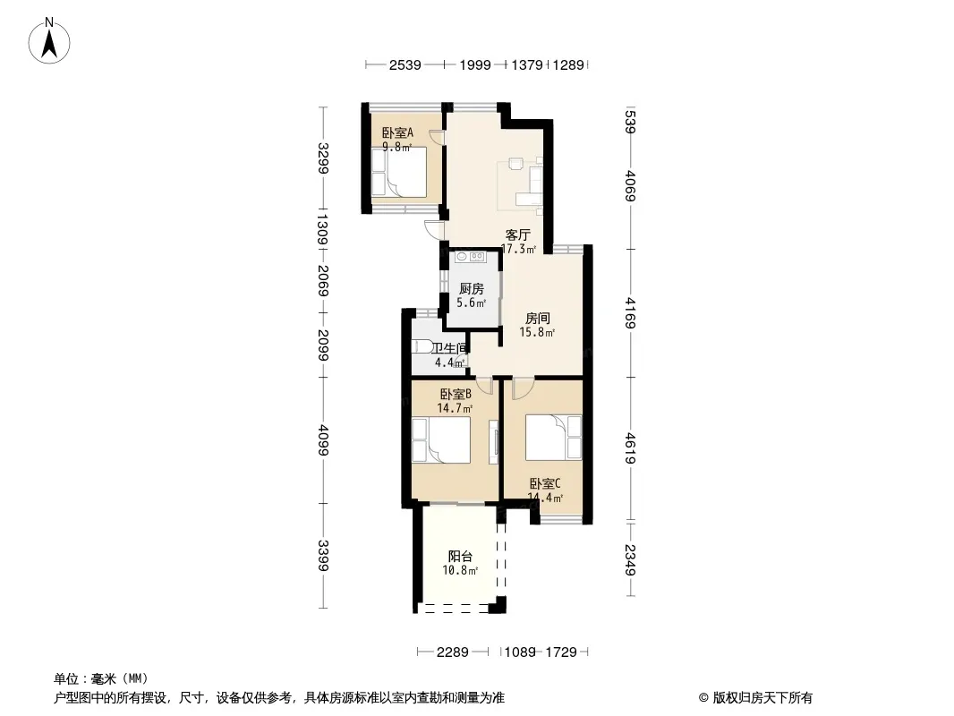 户型齐全,主打明卫,明厨,客厅朝南,双卧朝南三居