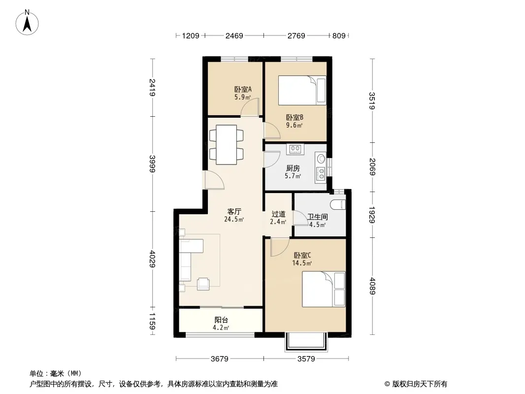 户型齐全,主打明厨,明卫,客厅朝南,双卧朝南三居