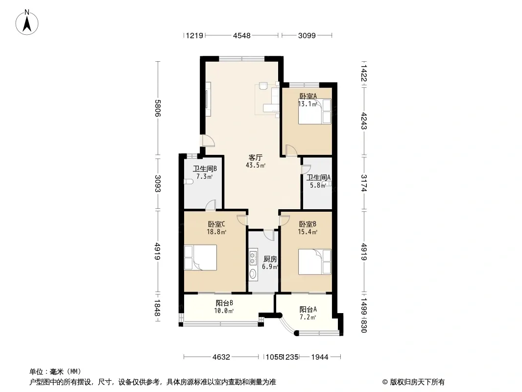 户型齐全,主打明卫,客厅朝南,双阳台三居
