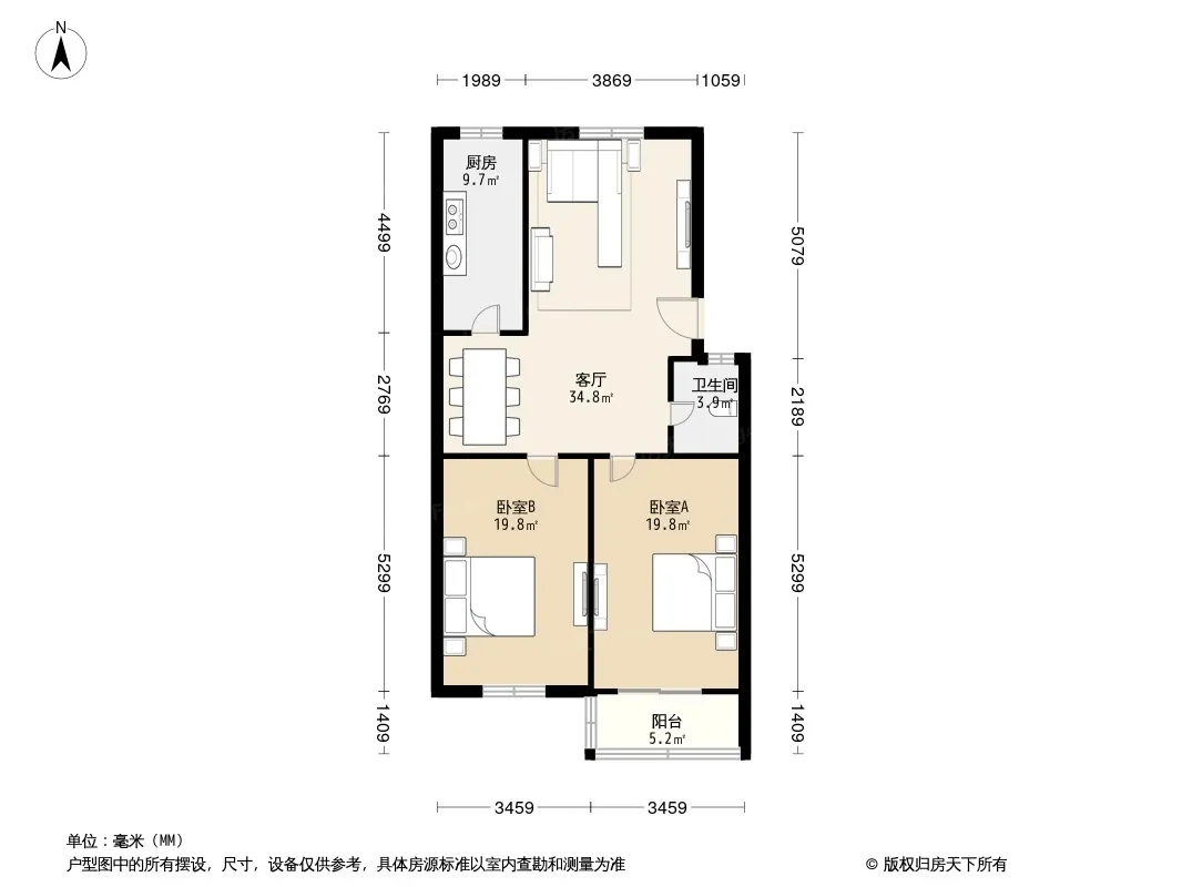 户型齐全,主打明卫,明厨,客厅朝南,主卧朝南二居