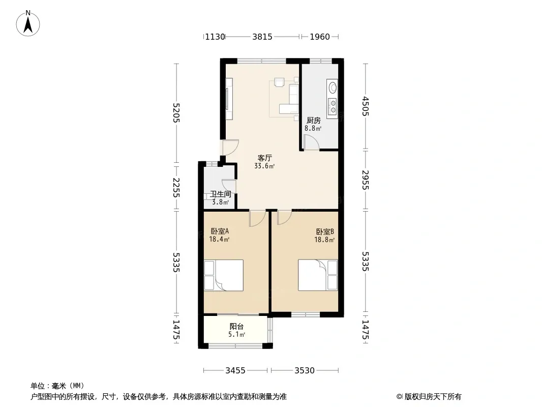 户型齐全,主打明卫,明厨,客厅朝南,主卧朝南二居