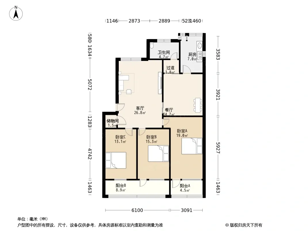 户型齐全,主打明卫,明厨,客厅朝南,双阳台三居