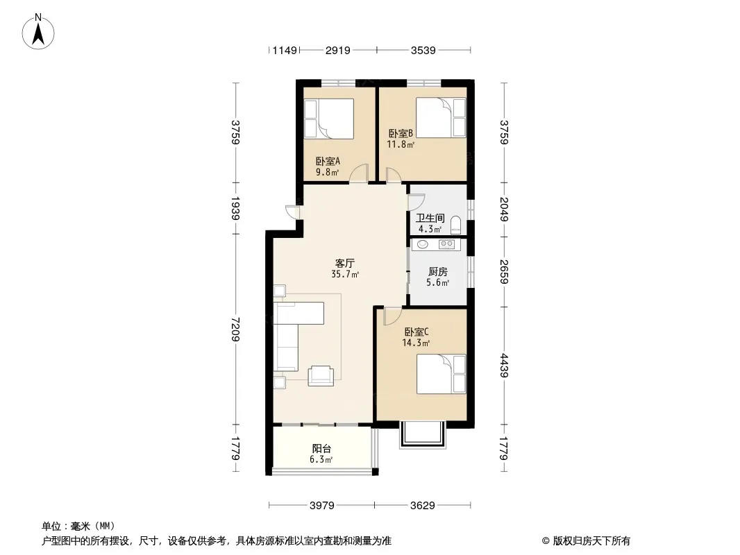 户型齐全,主打明厨,客厅朝南,双卧朝南,主卧朝南三居